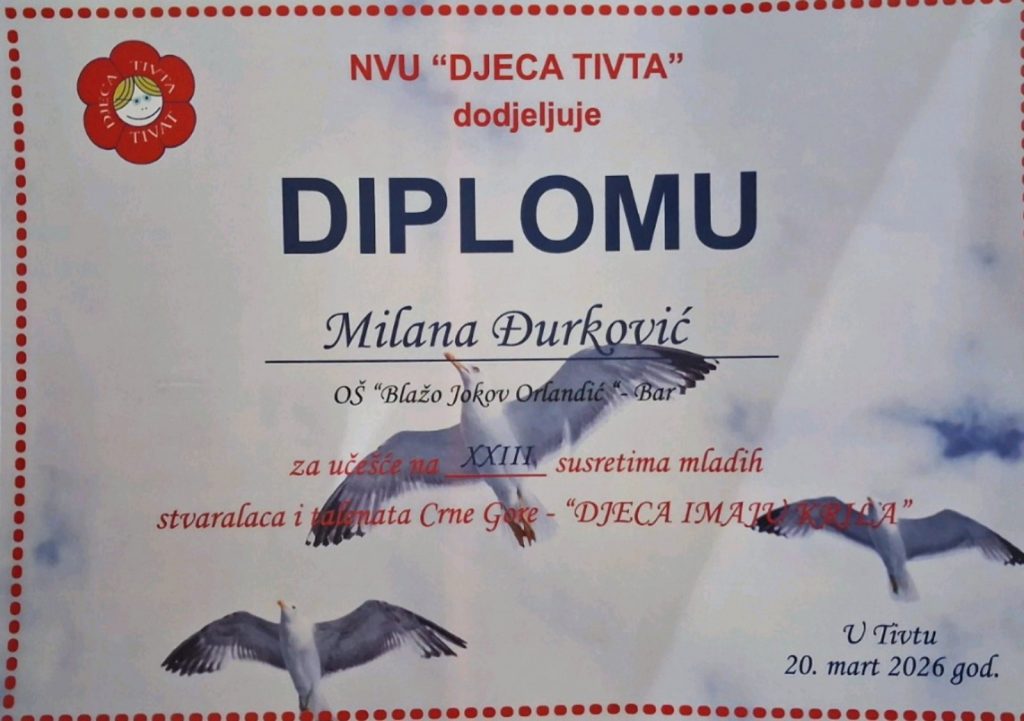 Na 23. Susretima mladih stvaralaca i talenata Crne Gore, održanim 20. marta u Tivtu pod sloganom „Djeca imaju krila“, našu školu predstavljala je Đurković Milana – jedna od naših najboljih recitatora. 🎤